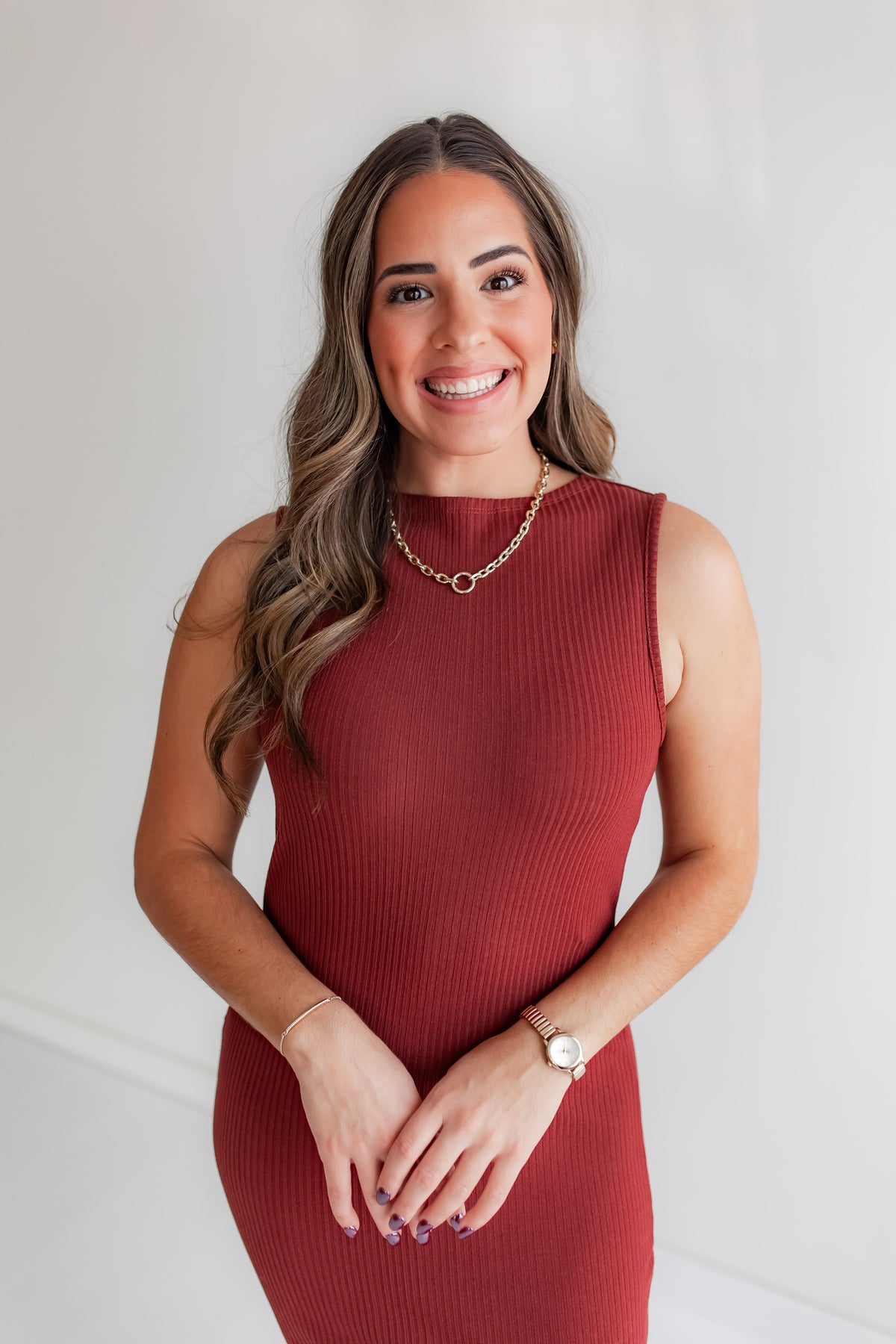Woman wearing a rust color midi dress against a white background