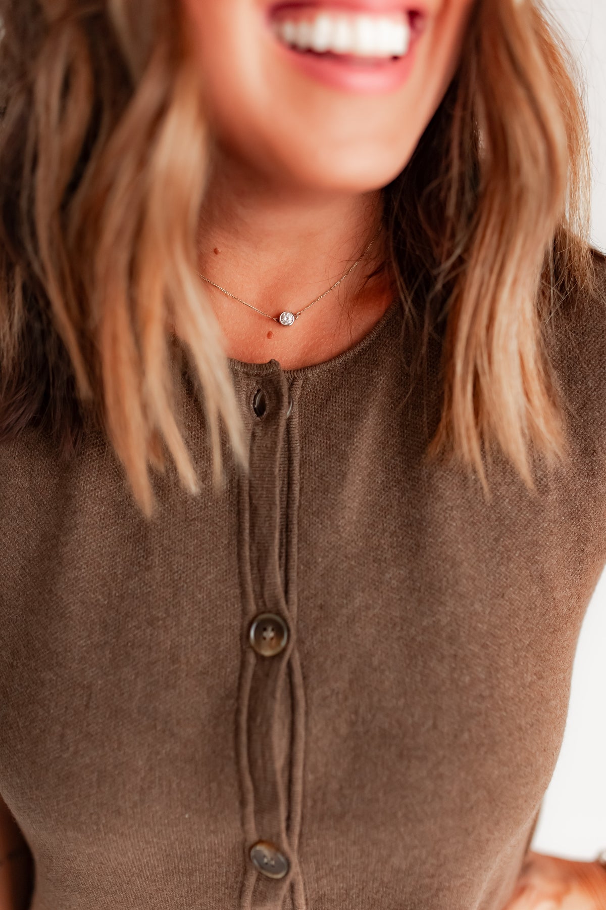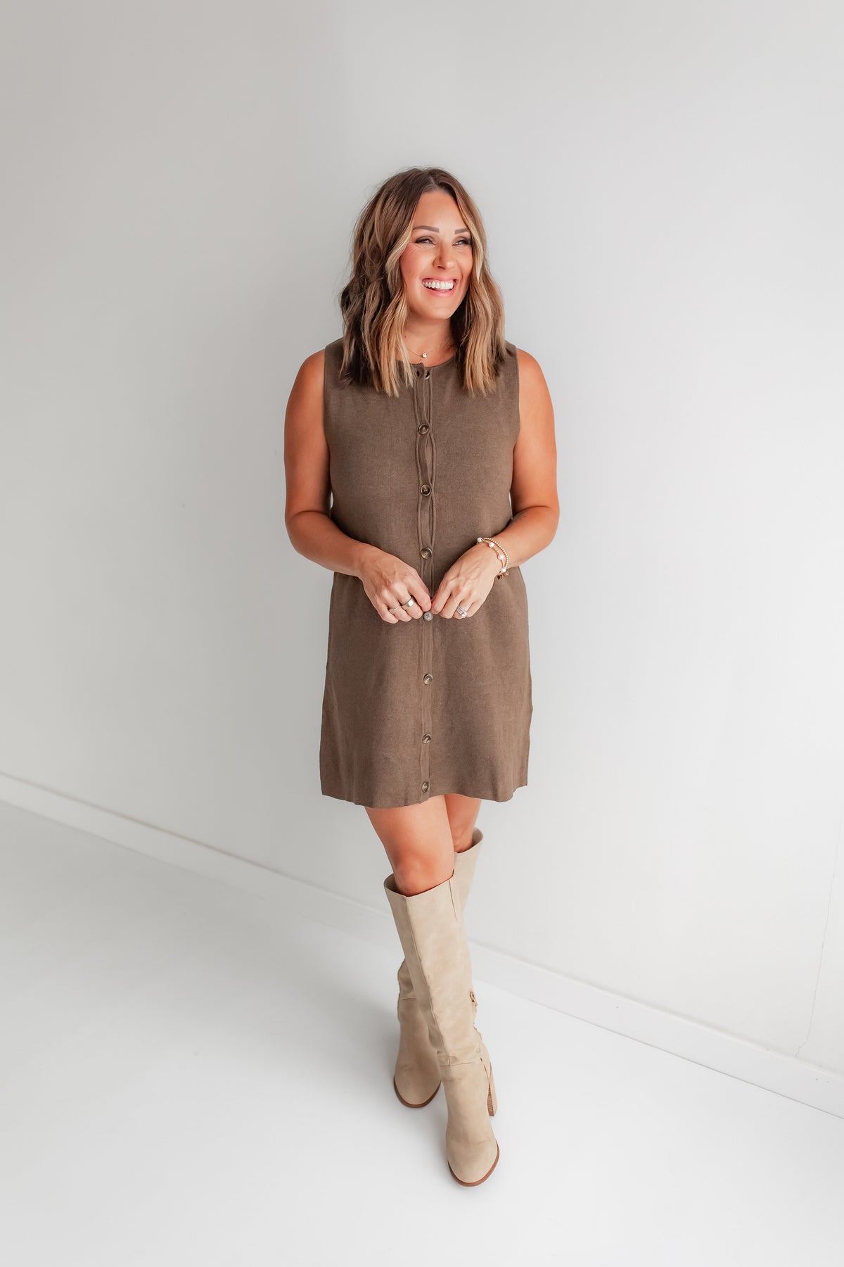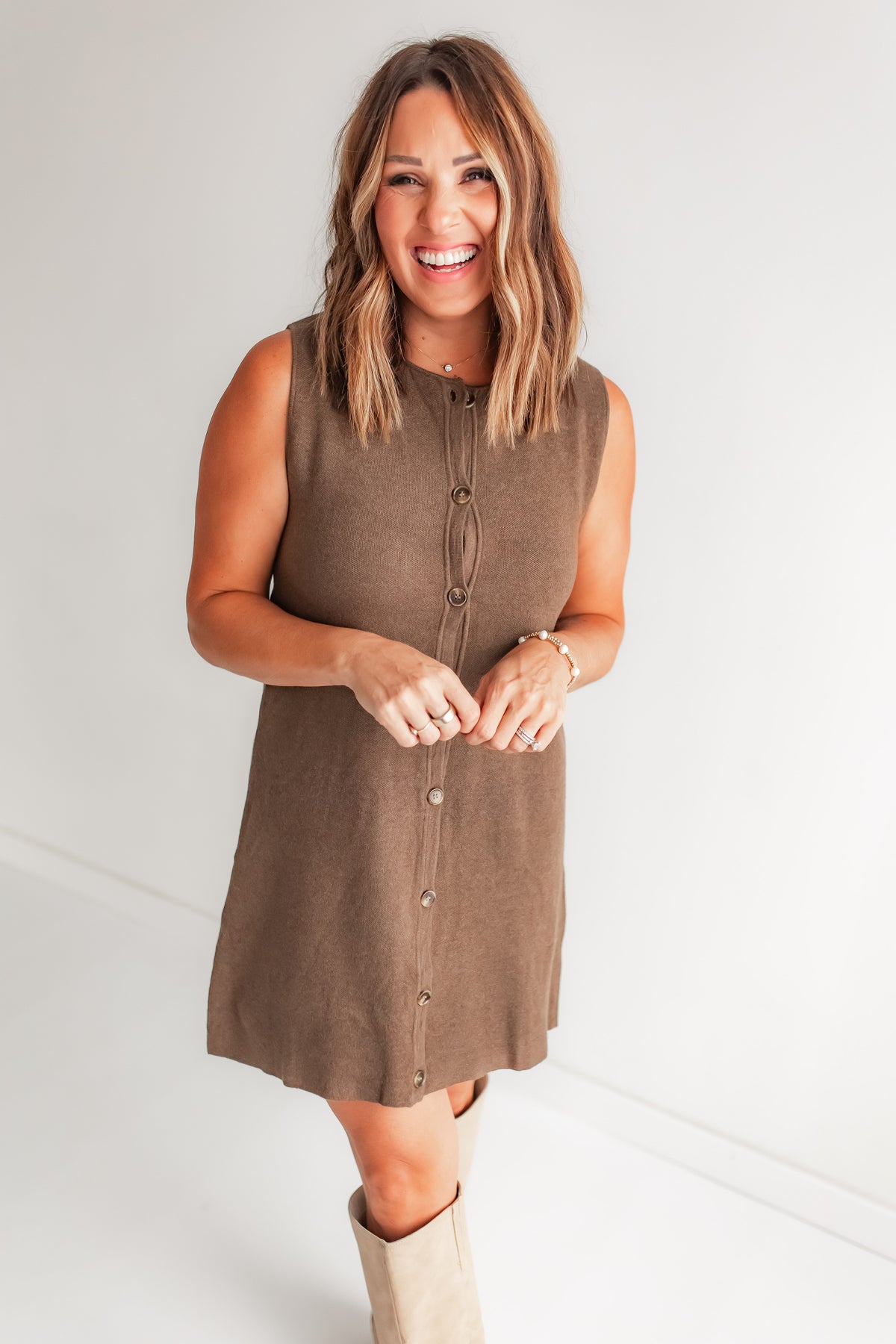 The Simple Slate Dress is the perfect soft, lightweight sweater dress for fall. This sleeveless brown dress features a classic, functional button-up design from top to bottom. Its soft material makes it comfortable for all-day wear. Layer it with a moto jacket or a cozy cardigan, and complete the look with tall boots for a chic, effortless ensemble.