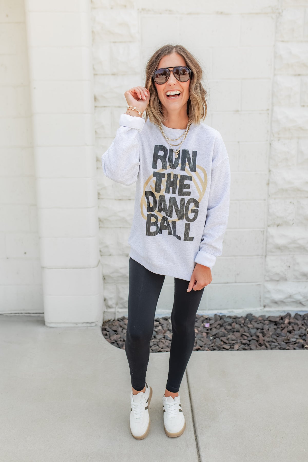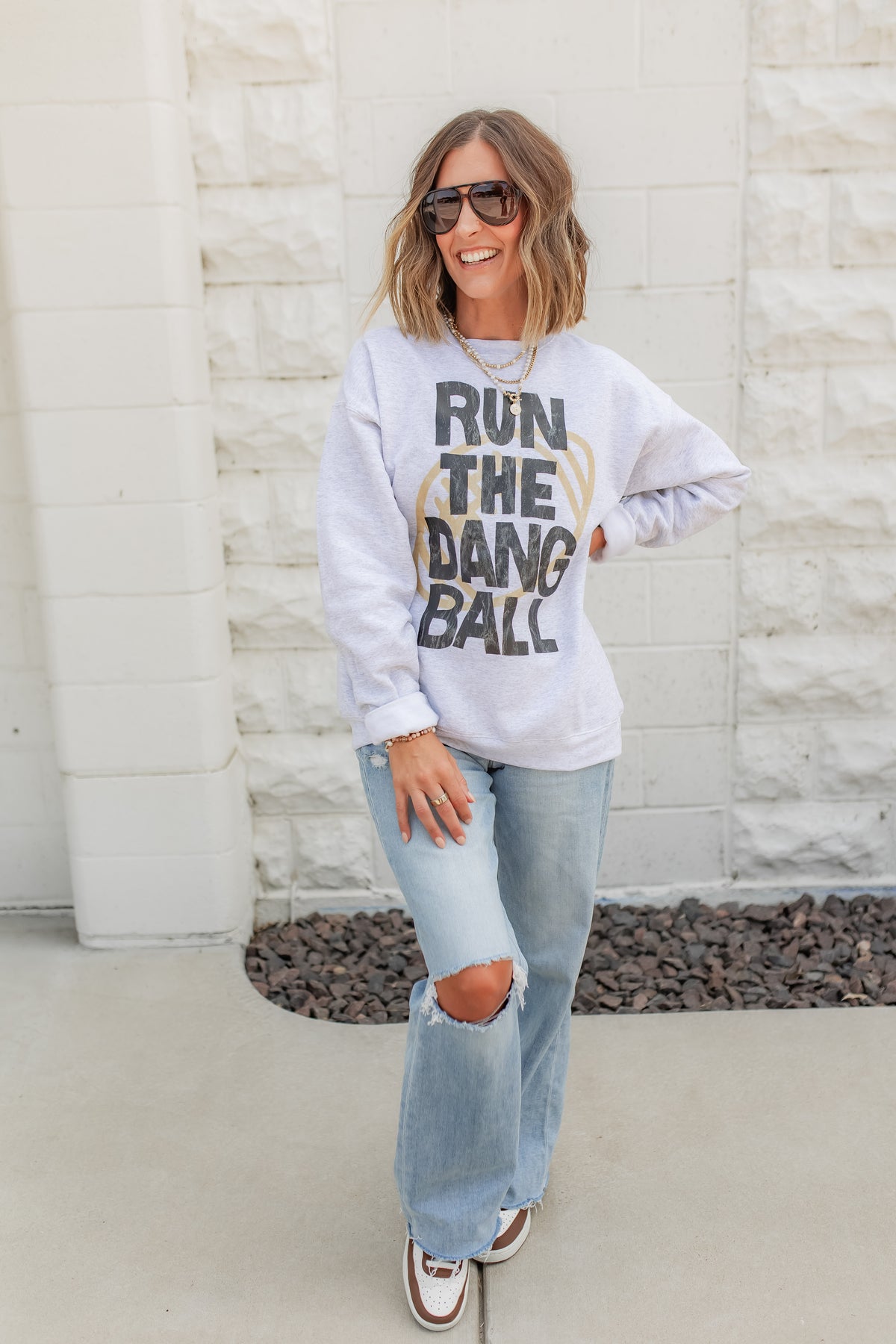 Fall football essential: a heather grey sweatshirt with bold Run The Dang Ball graphic. Cozy-soft inside and perfect for Friday night lights or game-day style. Size up for an easy oversized fit.