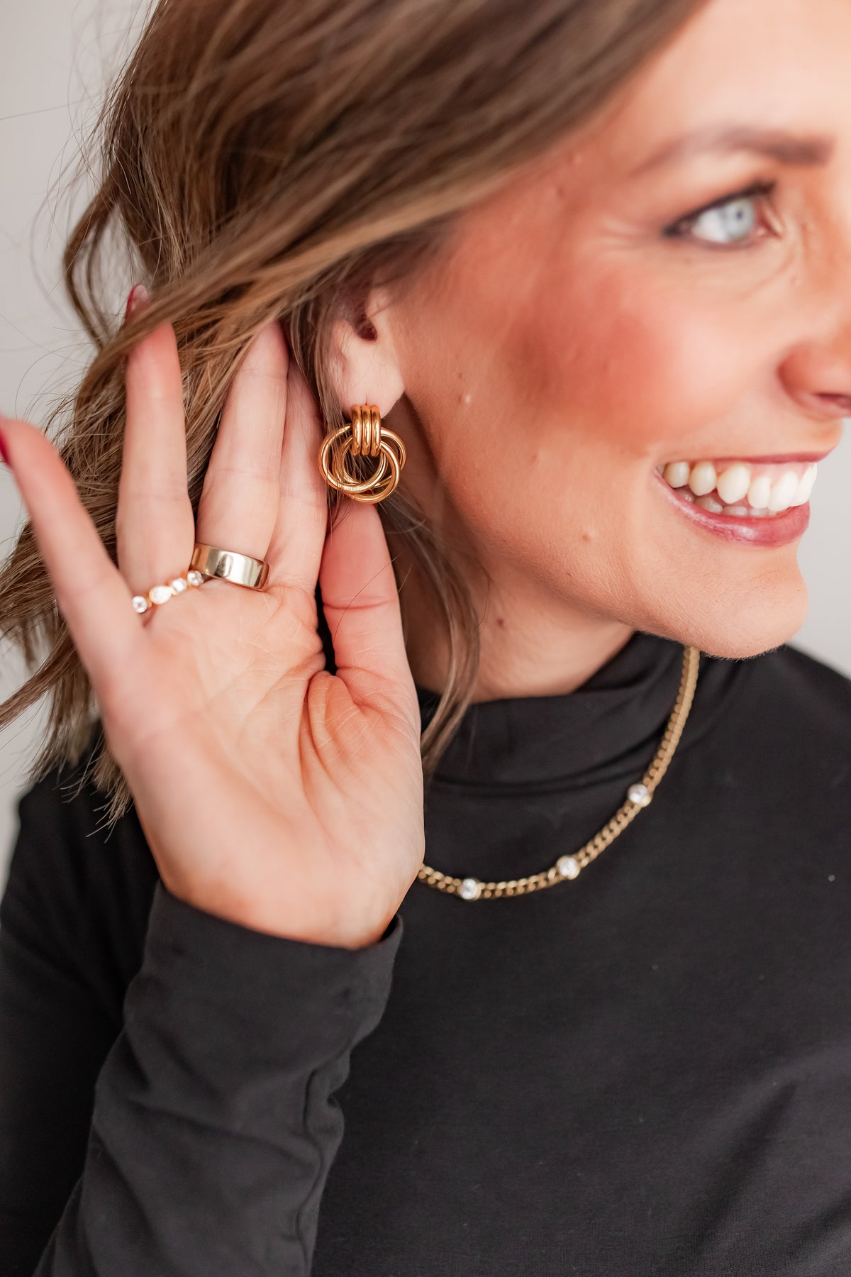 - Double Loop Design: The interlocking or layered loops create a unique, refined visual interest.