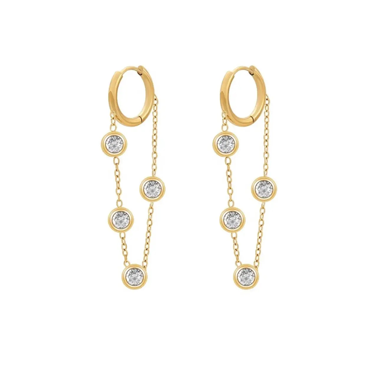 Add an edgy, celestial sparkle to your look with The Stellar Chain Hoops. These unique earrings combine the classic hoop silhouette with delicate dangling chains, featuring small circle crystals scattered throughout the design. The chains create beautiful movement, while the tiny crystals catch the light for a subtle, constant shimmer.