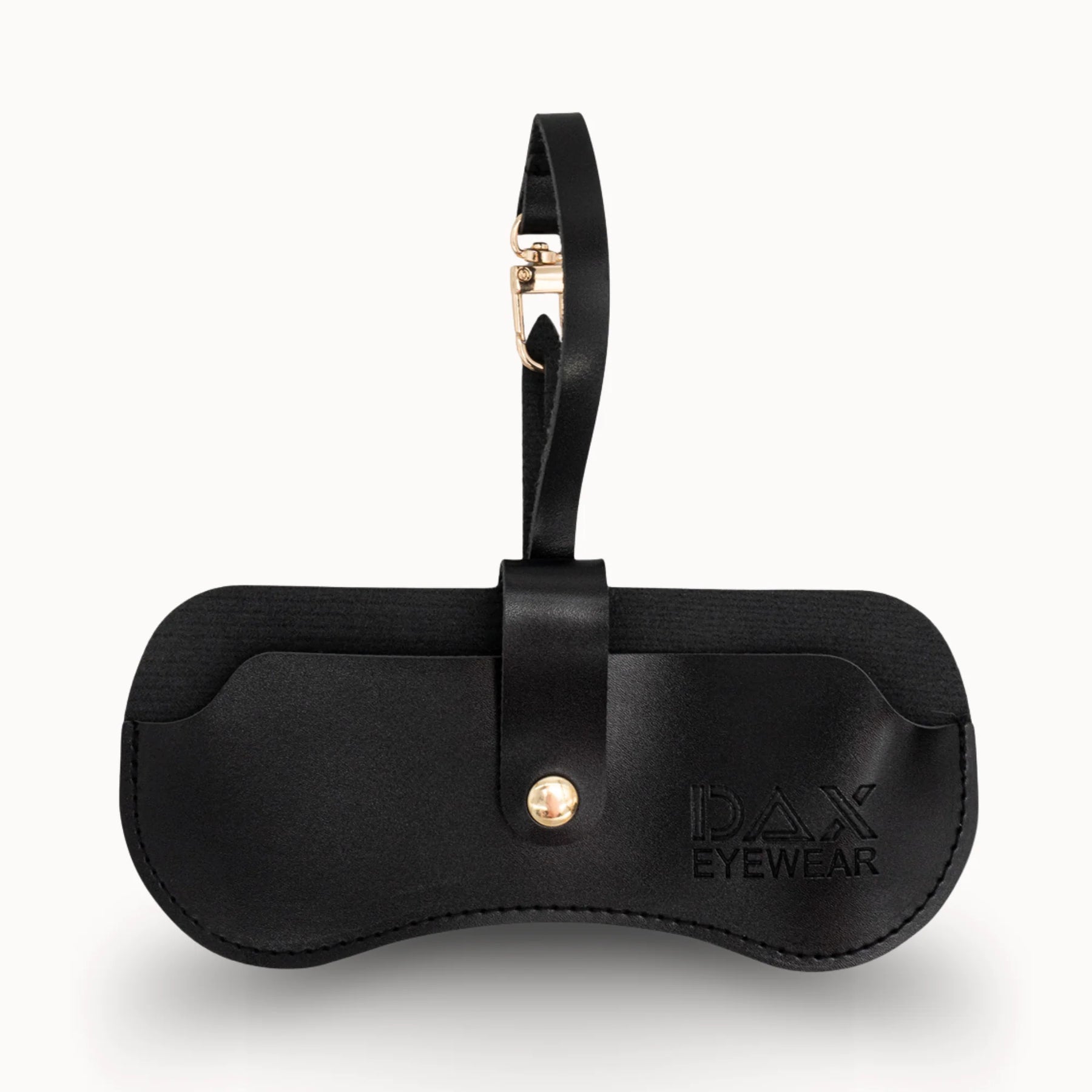 Black sunglasses case with 'DAX EYEWEAR' branding on a white background