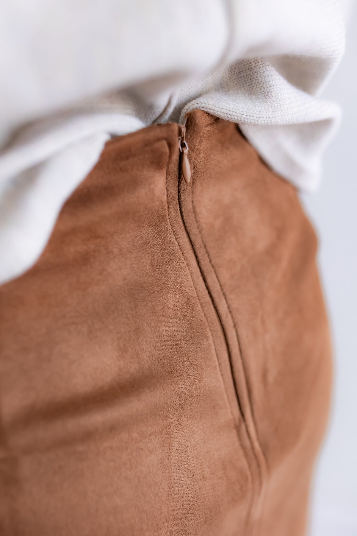 Elevate your fall staples with The Spiced Suede Midi Skirt. This skirt is made from a comfortable stretchy tan suede-like material, offering a luxurious texture. It features a chic midi length with a stylish slit and a zipper back. This is the perfect fall staple for adding texture to any look.