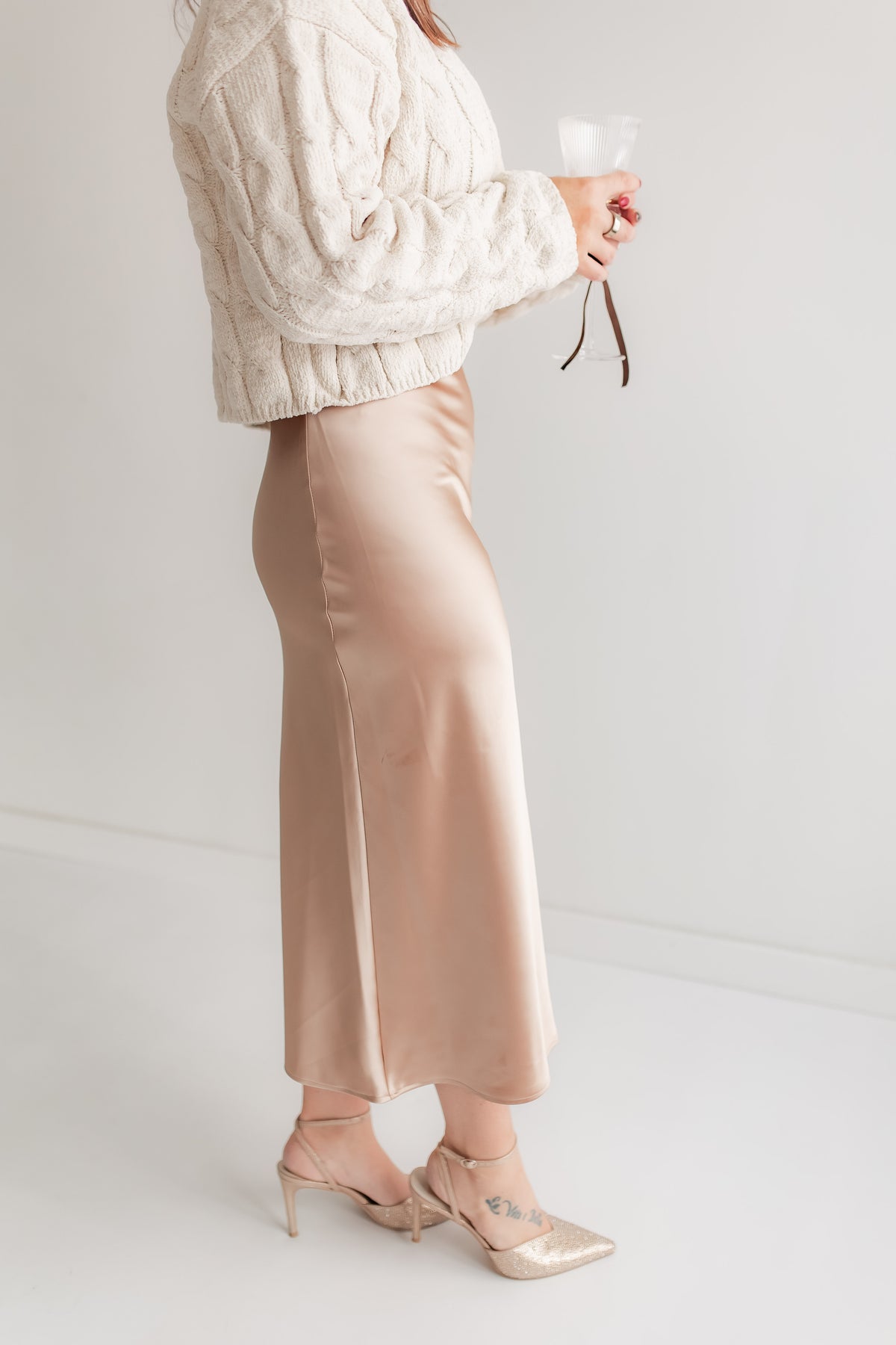 Glow for the holidays in The Frosted Champagne Midi Skirt. This flowing skirt is a beautiful, light champagne color with a comfortable elastic waist. It's the perfect piece to create that chic monochromatic look when paired with cream sweaters, or to wear as a sophisticated neutral base for any holiday top.