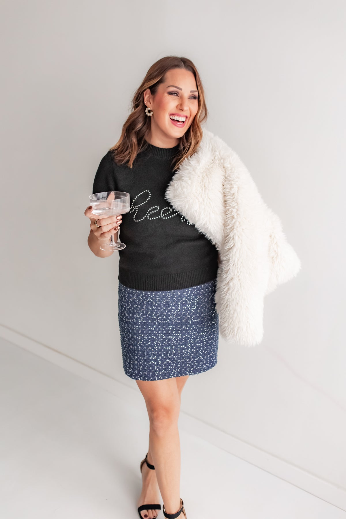 Pair this skirt with The Cheers Sweater Top for a coordinated New Year's Eve outfit. Wear it with a simple black mockneck (like the Signature Turtleneck) and sheer black tights with heels.
