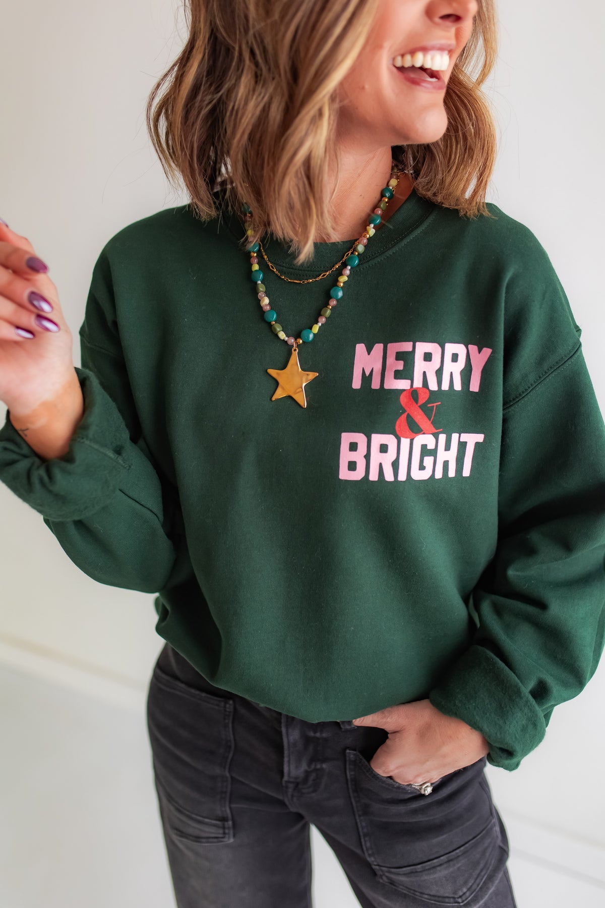 Spread holiday cheer with The Merry and Bright Sweatshirt! This cozy forest green sweatshirt features a festive graphic reading "Merry and Bright" in eye-catching red and pink lettering. It's the perfect comfortable piece for bringing a cheerful and colorful vibe to all your holiday activities.