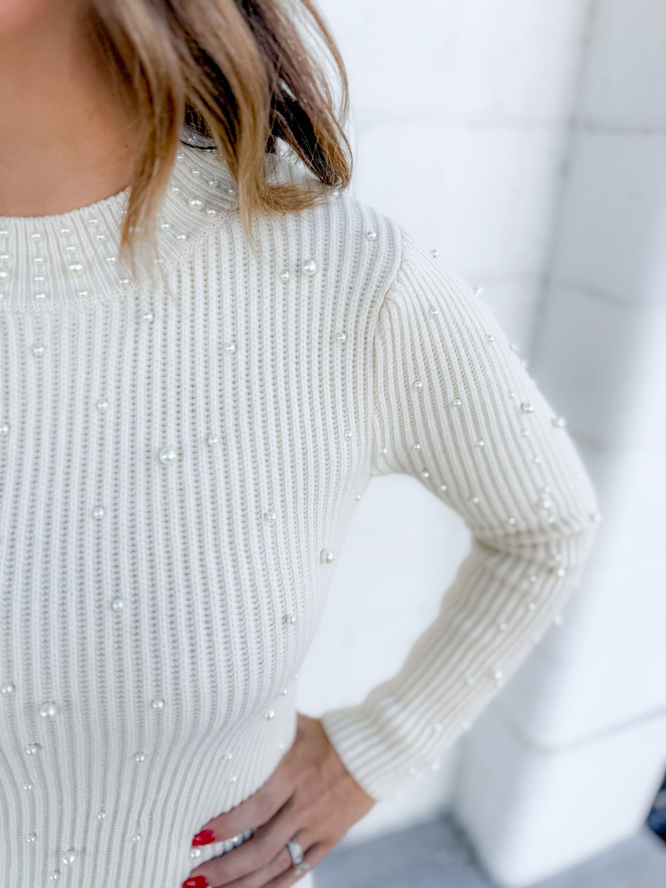 • Luxe Pearl Embellishments: Dainty pearls throughout the bodice and sleeves bring a touch of glamour to a classic knit.