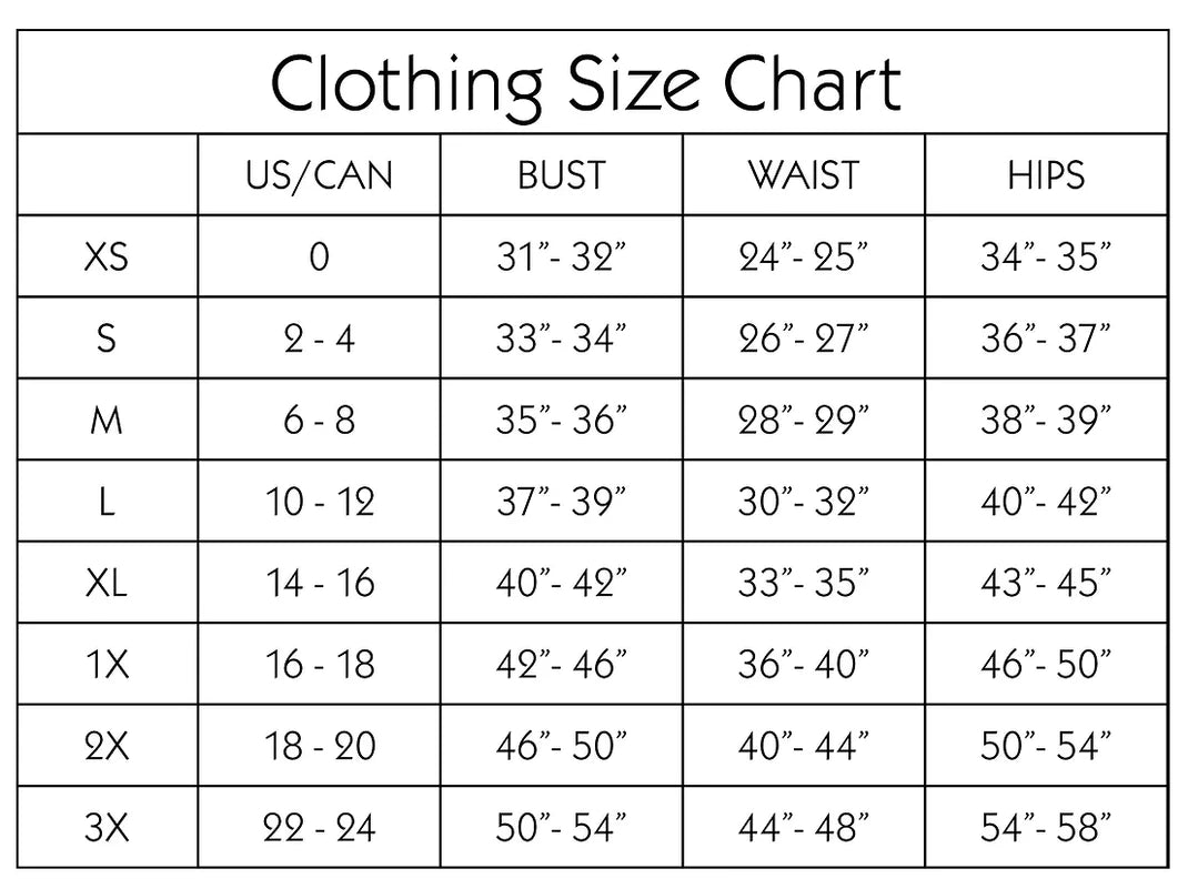 Please keep in mind, this is a standard chart and can have some variation depending on the fabric and style of product. We always suggest referring to the description of each item as we do our best to be very specific in the sizing for every item.